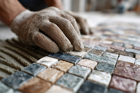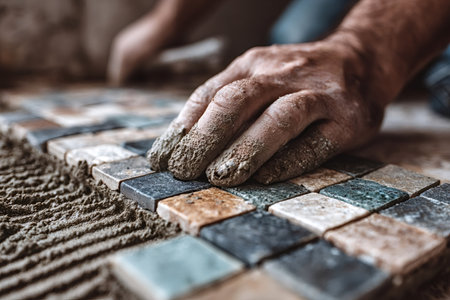 Construction worker placing mosaic tiles on the floor, creating a decorative pattern with hands covered in cement and dust, showing precision and craftsmanship in home renovation