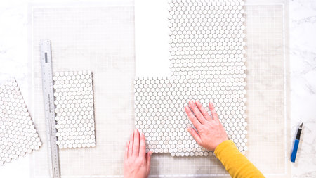 Flat lay. In the process of mounting peel and stick mosaic tiles onto a foam board, perfect for enhancing a food photography studios aesthetic.