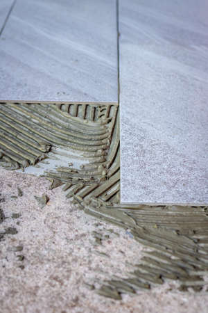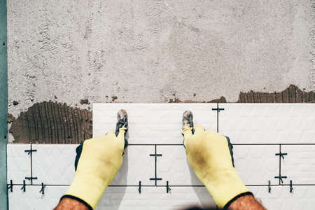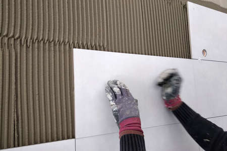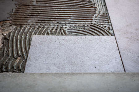 Tiler placing porcelain tile in position over adhesive. Floor tile installation