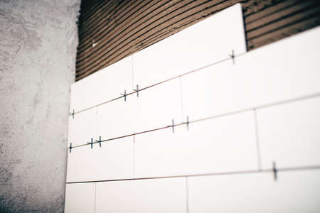 Wall cladding. White glazed ceramic tiles with tile spacer and glue on a concrete wall. A fragment of a laid tile