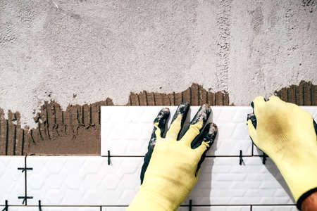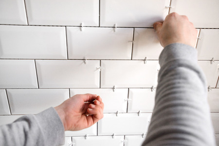 Ceramic tile lying. Installing new subway or metro tiles in bathroom, shower or kitchen back splash during home renovation. Placing or taking out tile spacers with hands and pliers.