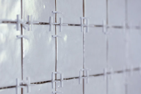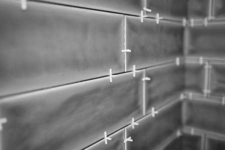 Bathroom renovation, close up details of plastic distancer on ceramic tiles and adhesive on walls