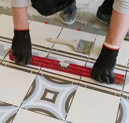 Laying colored ceramic tiles on the concrete floor in the living room of a city apartment. In working hands holding a hammer debugging.