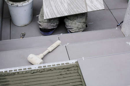 Tiler hands working on a new house entrance, local and professional handyman applying tiles to the steps.