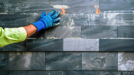 A person wearing a blue glove applies grout on slate tiles during a home renovation project. This image captures the detailed manual labor involved in interior design.