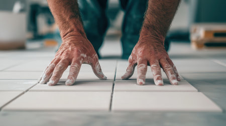 Close-Up of Skilled Worker Placing Ceramic Tiles on Floor with Focused Hands and Fine Details in Construction and Renovation Project