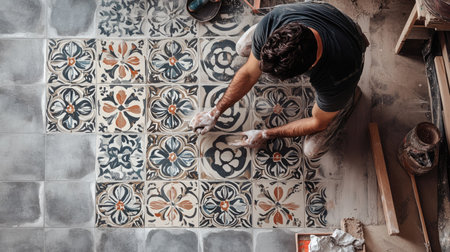 A skilled craftsman is seen focused on laying tiles with precision and care during a home renovation project, showcasing intricate details and techniques.