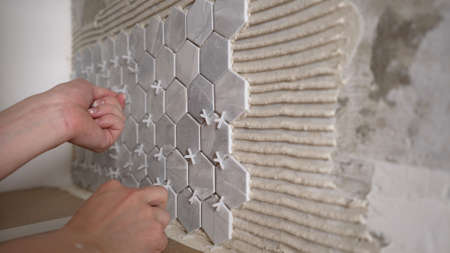 The hands of the master glue the mosaic tiles. Laying gray mosaic tiles by the hands of a master. Mosaic tile kitchen apron.