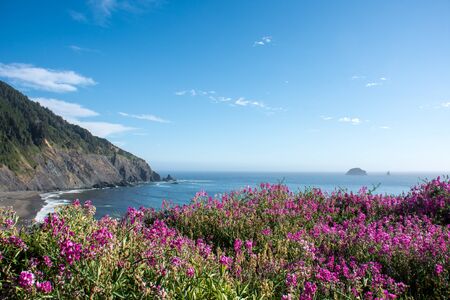 Purple pink wildflowers grow along the Oregon coastline on the Pacific Ocean, on highway US 101. Seastacks in the background
