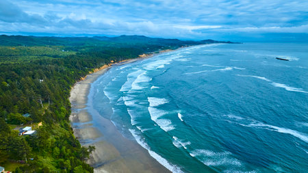 Aerial Photography, rugged coastline of the Pacific Northwest, temperate oceanic climate, rocky shores, dense forests, interplay of land and sea.