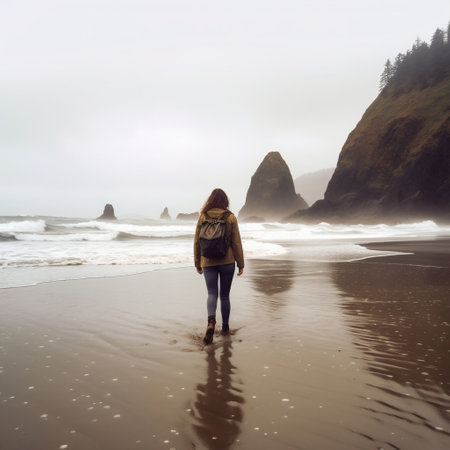Woman Traveler on Oregon Pacific Coast during Rainy Day AI
