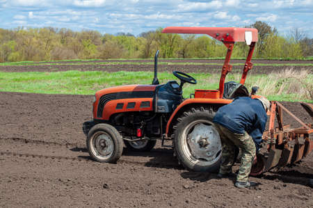 farmer prepares plowing mechanism for work on farmland soil in spring