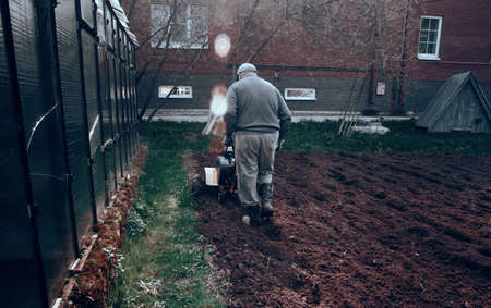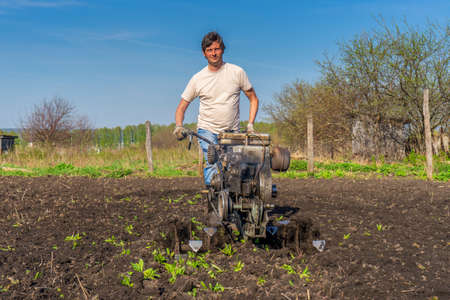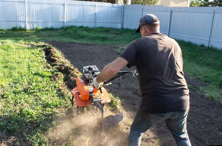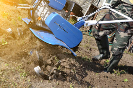 Farmer plows the land with a cultivator, preparing it for planting vegetables, on a sunny day garden