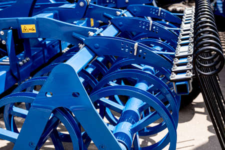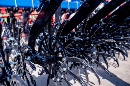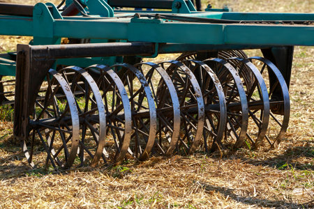 Agriculture equipment concept. Detailed closeup of disc harrow, agricultural machinery. Outdoor shot