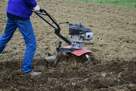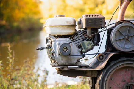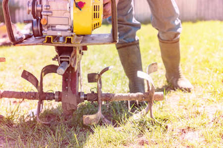 A close up view on motor cultivator during plow process spring season garden works concept