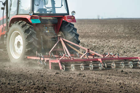 The tractor is cultivating the soil with harrow.