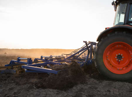 Tractor with cultivator plowing field. Tractor disk harrow on ploughing a soil. Planting in farmland. Sowing seed on plowed field. Seeding in agriculture. Farm Machinery for cultivating. Tractor flow.