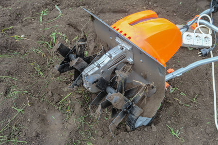 Electric cultivator cultivates soil in vegetable garden. Ripper knives spin in fast motion.