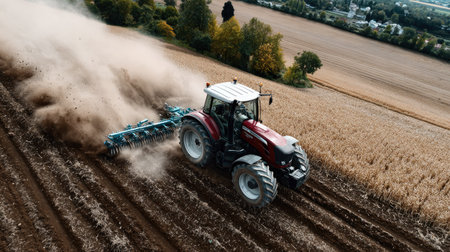 This aerial image captures a powerful tractor efficiently tilling the fertile soil in a vast field. The surrounding landscape features vibrant trees and a picturesque rural setting, showcasing the harmony between technology and nature in modern farming practices.