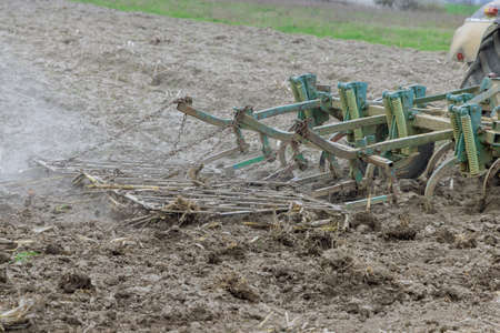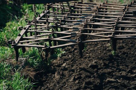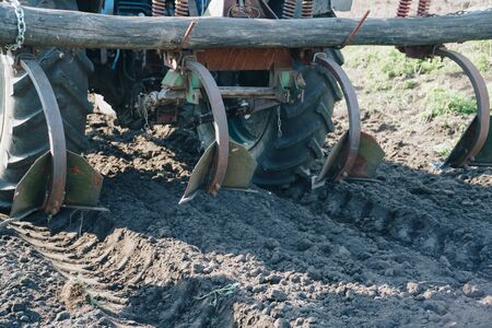 Spring shock absorbers cultivator. A fragment of agricultural machinery for loosening plowed fields. Mechanization of labor in the farm. Mechanical engineering for growing plants in the open field.