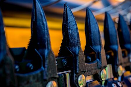 Agricultural harvesting industrial equipment concept. Agriculture machinery. Closeup of cutting chains
