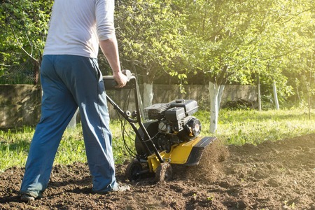 Man working in the spring garden with tiller machine.