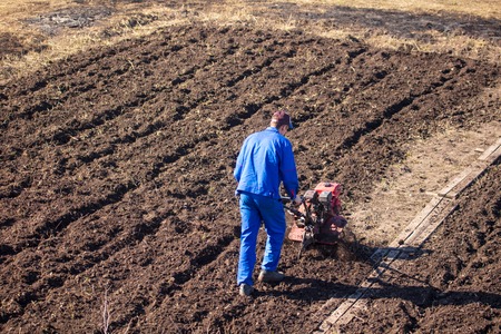 A man working in the field - dripping ground the motor-block with plow in working clothes