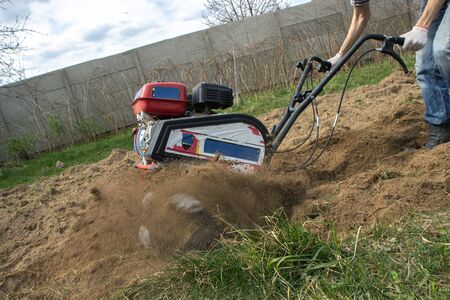 Cultivating garden soil in the spring with a rototiller