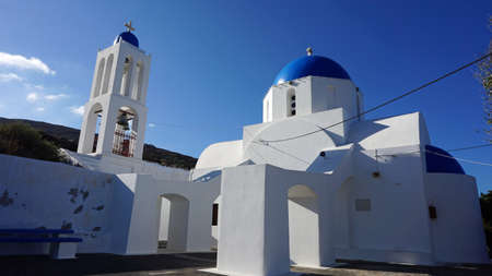 Pano Koufonisi island, Greece. Old and new traditional stonewall building, in white and blue color Cyclades architecture. Empty cobblestone street, blue sky background.
