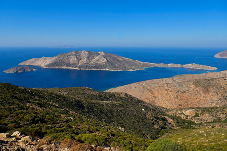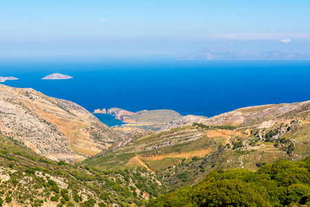 Greece, Amorgos, view towards the small island of Nikouria opposite Agios Pavlos, a very popular bay for anchoring and swimming.