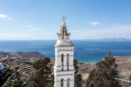 Cyclades, Greece. Tinos Greek island, Panagia church belfry over blue sea and sky aerial view, rocky landscape, sunny day