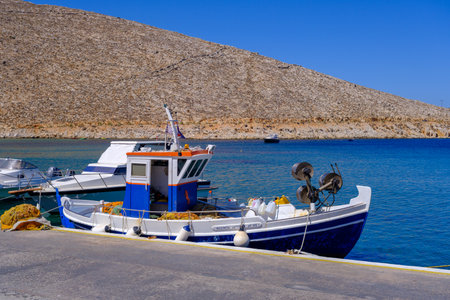 Tilos, Greece - June 2021: The picturesque island of Tilos near Rhodes, part of the Dodecanese island chain, Greece.