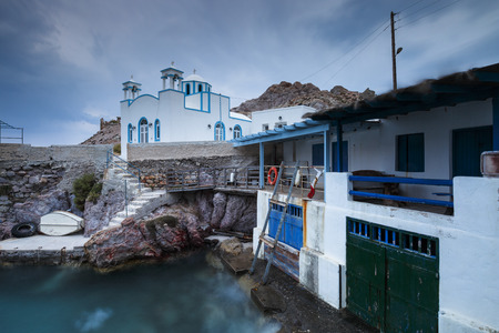 Milos island, Klima fishing village, Cyclades Greece. Colorful doors and windows, white waterfront traditional fishermen houses, view from the sea. Boats moored at rippled sea