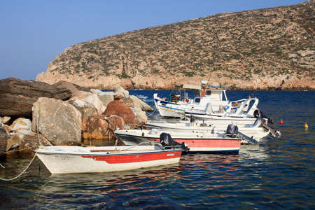 Fishing boat mooring in the port of Karavostasi on Folegandros island. Cyclades, Greece