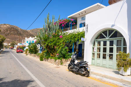 Cyclades Greece. Milos island, traditional buildings on the coast Waterfront houses with colorful doors and windows, view from the sea.