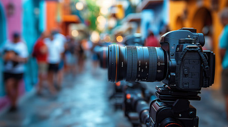 A high-quality camera is positioned on a tripod, ready to capture beautiful shots in a modern cafe.