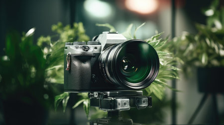 A professional camera mounted on a tripod amidst vibrant green plants, capturing the beauty of nature in an outdoor setting.