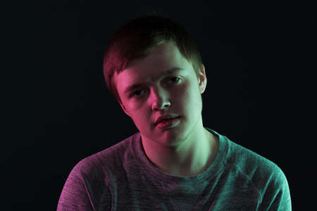 bearded white man on a contrasting multi-colored background blue and red. thoughtful look