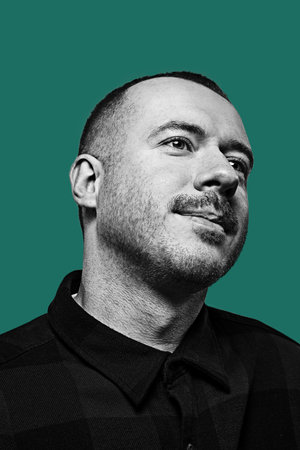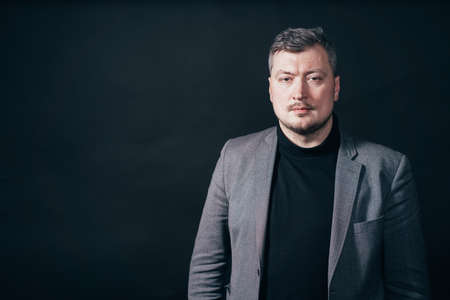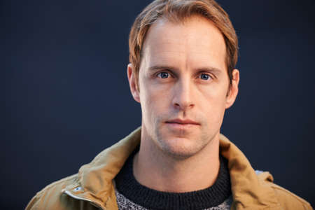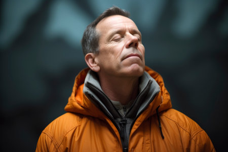 Portrait of a middle-aged man in an orange jacket on a dark background