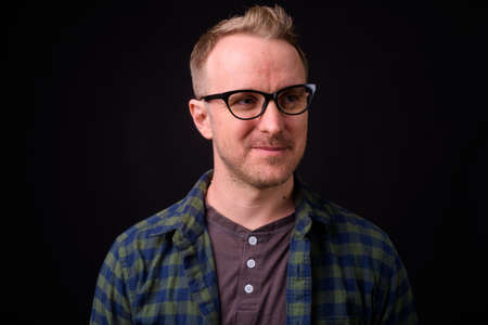 Close up portrait of young man isolated on black studio background. Photoshot of real emotions of male model. Crying throught laughting and smiling. Facial expression, human emotions concept.