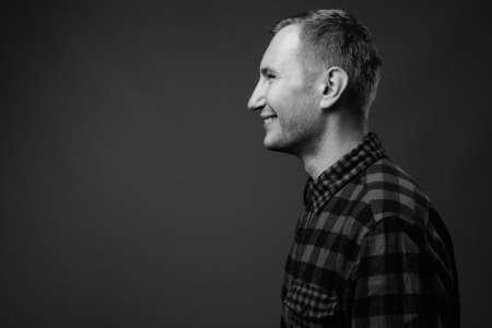 Portrait of mature bearded man in casual clothes smiling at camera against the white background