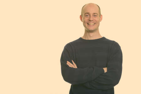 Portrait Of Casually Dressed Smiling Man Standing Against White Studio Wall