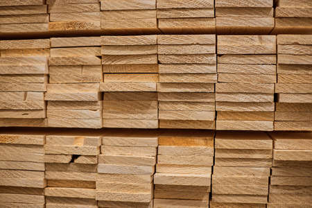 Hardware store, construction material for background and texture, Wood products, planks, lining, boards for construction works . Timber industry objects. Finished wood beams or plank at a warehouse.
