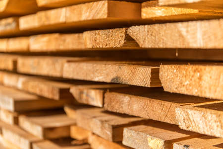 Stacked wooden carpentry boards from natural wood in a woodworking industry.