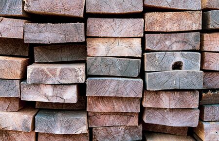 Wooden planks and beams. Air-drying timber stack. Wood air drying. Wood for house construction. Building material. Wood warehouse.