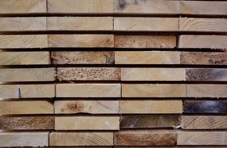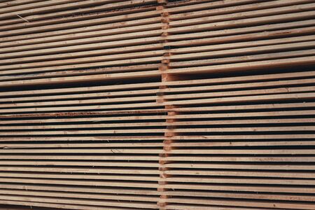 A large pile of boards sawn from trees on a sawmill for the procurement of building materials for construction. Construction industry.