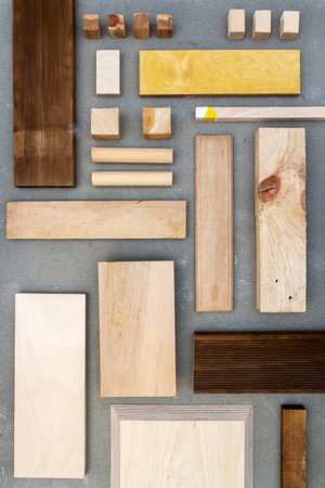 Flat lay of various wood and plywood pieces on concrete texture. Carpentry background.