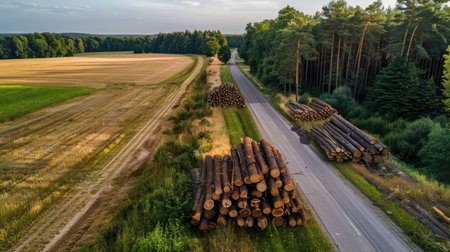 Pile of felled trees at the edge of the road, deforestation concept, aerial view