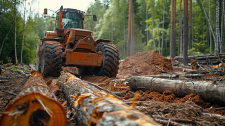 A heavy machinery vehicle efficiently clears a wooded area, transporting logs under a warm sunlight, highlighting the machinery's role in timber harvesting.