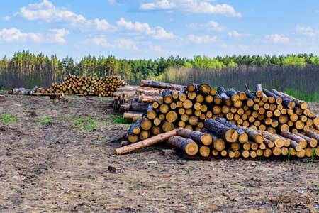 Stacked tree logs of pine wood in forest. Forest felling. Timber storage